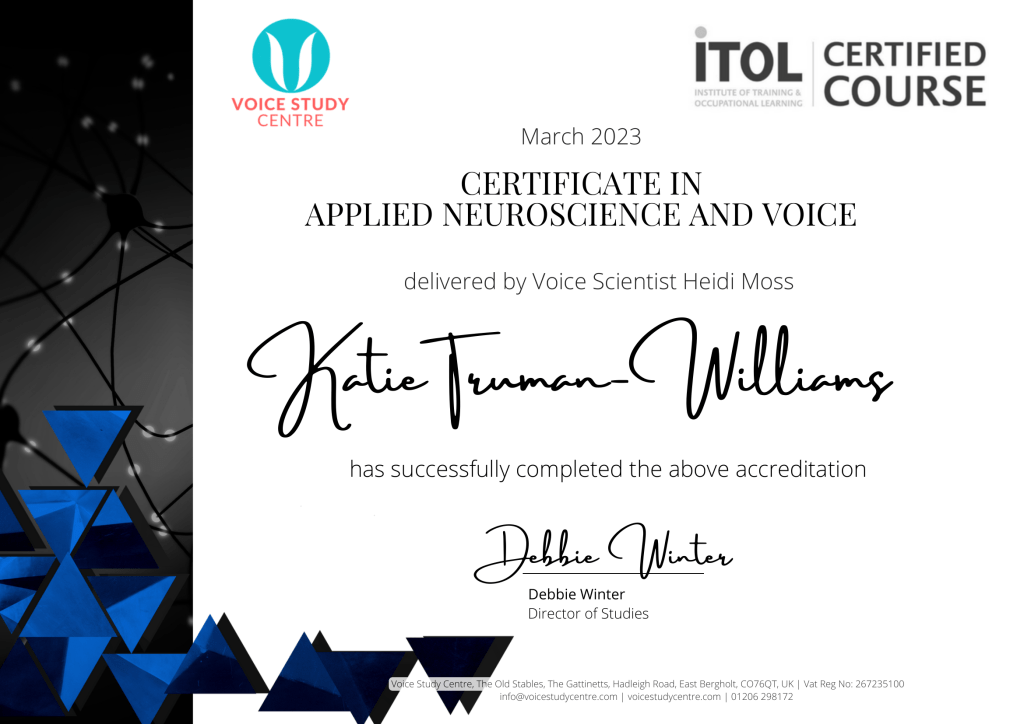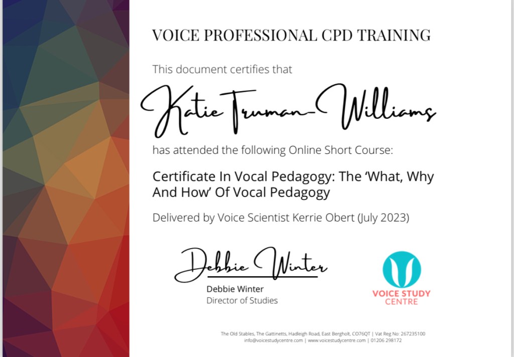 Katie is undertaking an MA in Voice Pedagogy with The Voice Study Centre. Her specialism is in approaches to accents and phonetics within contemporary choral settings.